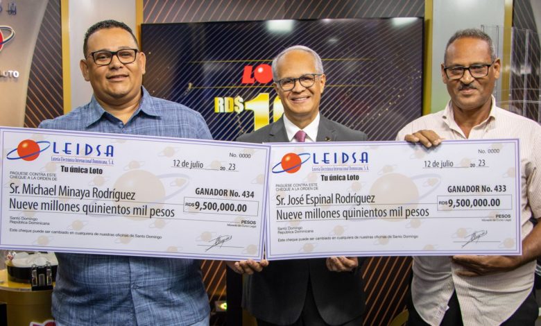 Santo Domingo.- El LOTERÍA ELECTRÓNICA INTERNACIONAL DOMINICANA, SA, LEIDSA, "Tu único loto", Los ganadores entregaron los cheques a José Espinal Rodríguez y Michael Minaya, quienes se repartieron 19 millones de pesos en el sorteo de lotería del miércoles 21 de junio del presente año.