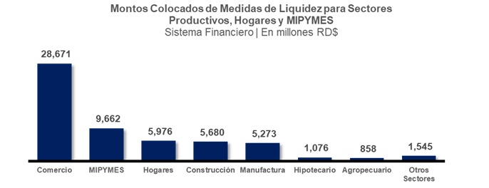 BC explicó que el monto desembolsado se desembolsó al sector comercio con RD$28,671 millones (48.8%); Mipymes, RD$9,662 millones (16.5%); consumo de los hogares, RD$5,976 millones (10.2%); Construcción por RD$5,680 millones (9.7%); Manufactura por RD$5,273 millones (8.9%); e hipotecas con RD$1,076 millones (1.8%) entre otros.