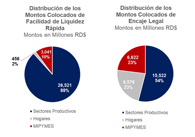 En cuanto a los activos liberados a través de reservas legales, el monto desembolsado es de RD$28,723 millones de los RD$34,000 millones aprobados por la Junta de Finanzas. De este monto retenido, RD$15,522 millones se destinaron al sector productivo (54%), RD$6,622 millones (23%) a MIPYMES y RD$6,579 millones (23%) a hogares.