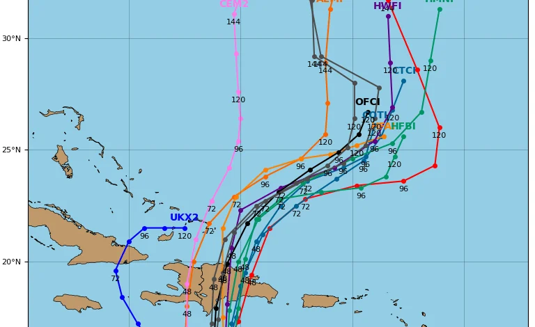 Dijo que cada una de estas rutas pronosticadas por los modelos de pronóstico es una mala noticia para la República Dominicana, "incluido el Reino Unido @MetOffice (azul). Para Haití, por otro lado, una trayectoria sobre la RD reducirá su precipitación acumulada. 375 mm de la lluvia es posible.