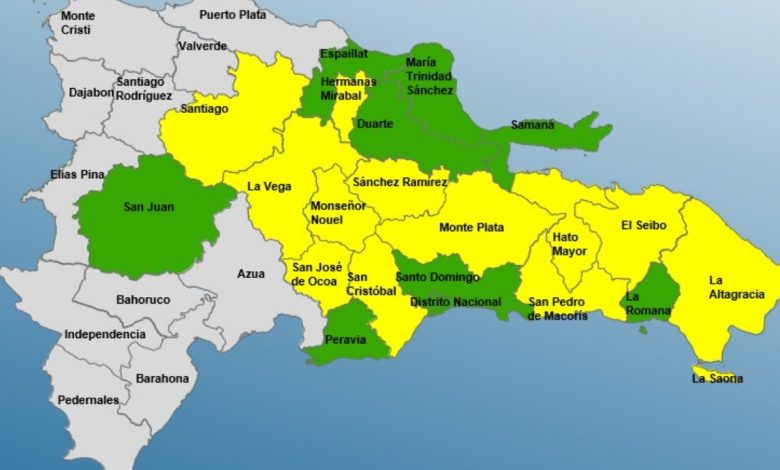 Las provincias bajo alerta amarilla son: Monseñor Nuel, Sánchez Ramírez, El Cibo, Monte Plata, Hato Mayor, Santiago, San Pedro de Macorís, La Vega, San José de Ocoa, San Cristóbal, La Altagracia, Hermanas Mirabal