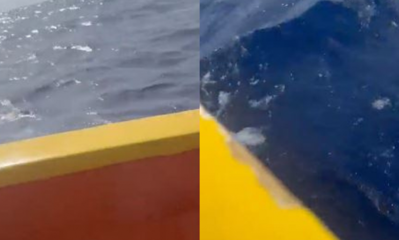 es video Se ve al hombre esposado y arrojado al mar desde el barco amarillo. Además, se puede escuchar en el audiovisual cuando una persona le dice a otros que tengan cuidado de no captar los rostros de quienes cometen delitos.