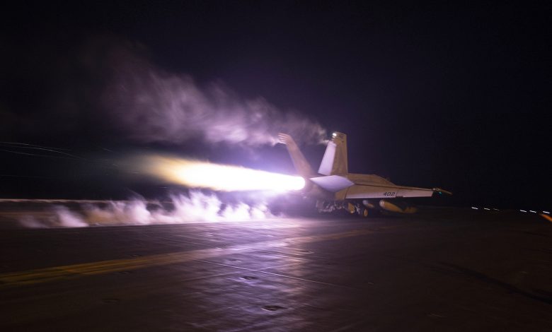 Esta imagen proporcionada por la Armada de Estados Unidos muestra un caza de combate partiendo del portaaviones USS Dwight D. Eisenhower (CVN 69) durante operaciones aéreas sobre el Mar Rojo,