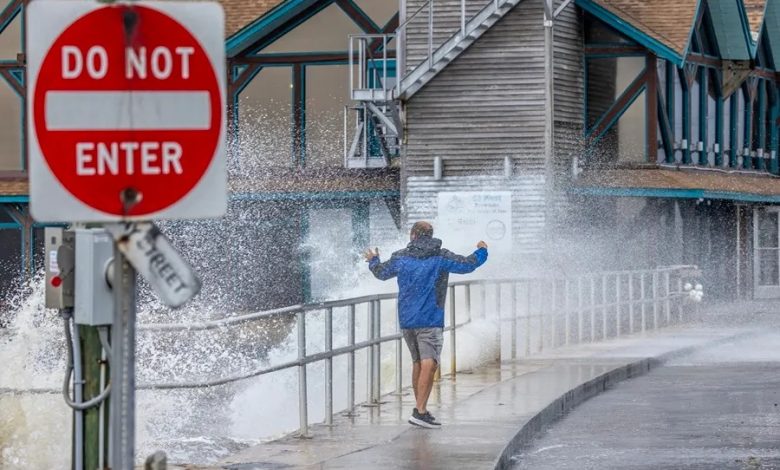 Una persona desafía las fuertes olas y vientos del huracán Helene en Cedar Key, Florida. EFE/EPA/Cristobal Herrera -Ulashkevich