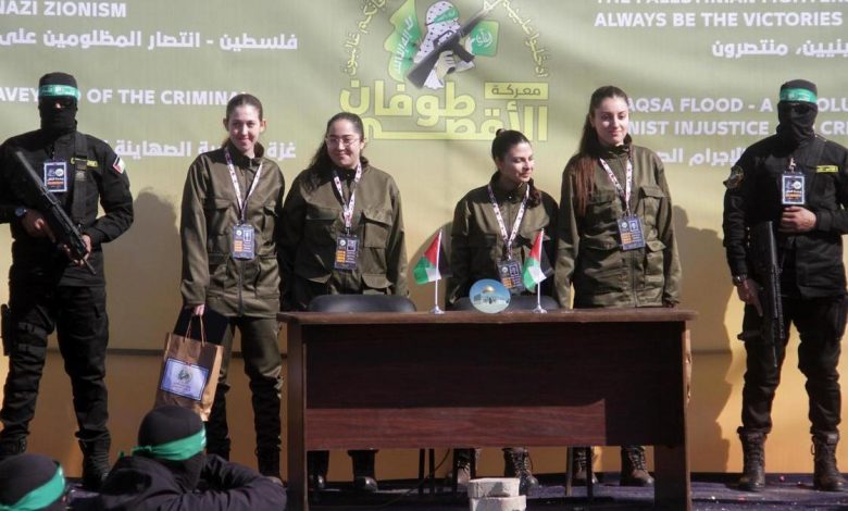 Las jóvenes, vestidas con ropas de color caqui que parecían uniformes militares, fueron conducidas a un escenario improvisado adornado con lemas antiisraelíes. Sonriendo, saludaron con la mano y con el pulgar hacia arriba a la multitud que silbaba antes de ser trasladadas a los vehículos de la Cruz Roja.
