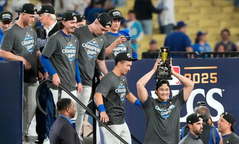 Al final de la noche, Ohtani estaba de pie en el centro del escenario en el Dodger Stadium, sosteniendo el trofeo de MVP de la NLCS después de que su equipo barrió a los Brewers con una victoria de 5-1 e instando a los fanáticos de los Dodgers de todo el mundo a brindar por los banderines consecutivos de la Liga Nacional.