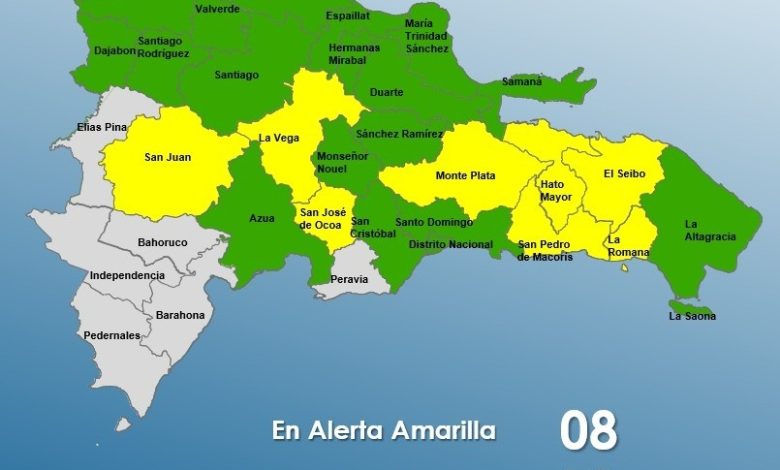 Entre las provincias subordinadas alerta amarilla Estos incluyen: La Vega, San Juan, Monseñor Nuel, San José de Ochoa, Monte Plata, La Romana, Santiago y San Pedro de Macorís.